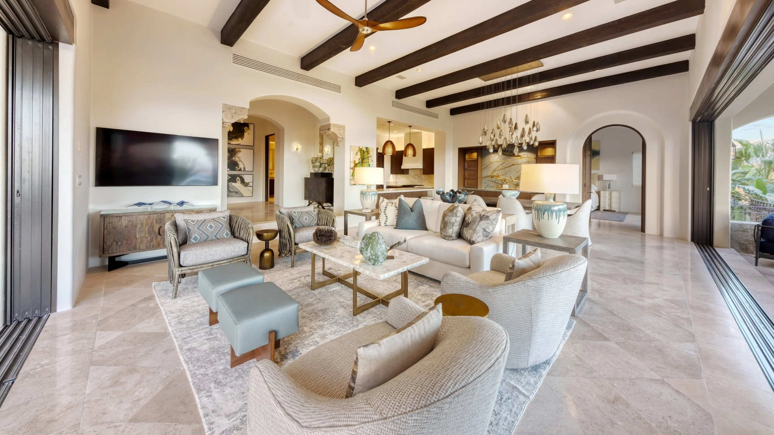Secluded and fragrant with bougainvillea, Jardín del Mar is a 3,600 square foot garden retreat above the Sea of Cortez with four bedrooms and four baths for up to eight guests. Walls of glass open to terraces where an infinity pool, attached Jacuzzi, fire pit, and cushioned lounging pods frame uninterrupted coastal views. Soft pastels and natural textures carry through bedrooms that step onto private patios, while a gourmet kitchen with a wine refrigerator supports effortless meals beside a spacious, plush living room. Alfresco dining is warmed by a ceramic kiva style fireplace for long, easy evenings under the stars. Your dedicated chef and butler keep every detail smooth, and a golf cart makes quick work of nearby adventures from the galleries of San Jose del Cabo to the Jack Nicklaus Palmilla course. In villa massages can be arranged for true downtime, making Jardín del Mar a calm, polished Los Cabos escape you will want to revisit.